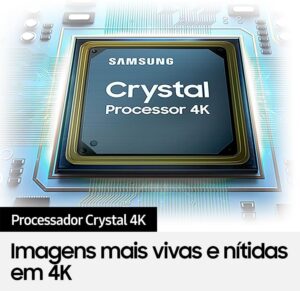 O grande destaque é o Processador Crystal 4K, responsável por otimizar o conteúdo exibido na tela, garantindo que até vídeos de resolução inferior sejam aprimorados para uma experiência mais imersiva. Além disso, o design Tela sem Limites elimina bordas visíveis, permitindo que sua atenção fique totalmente no que importa: o conteúdo.